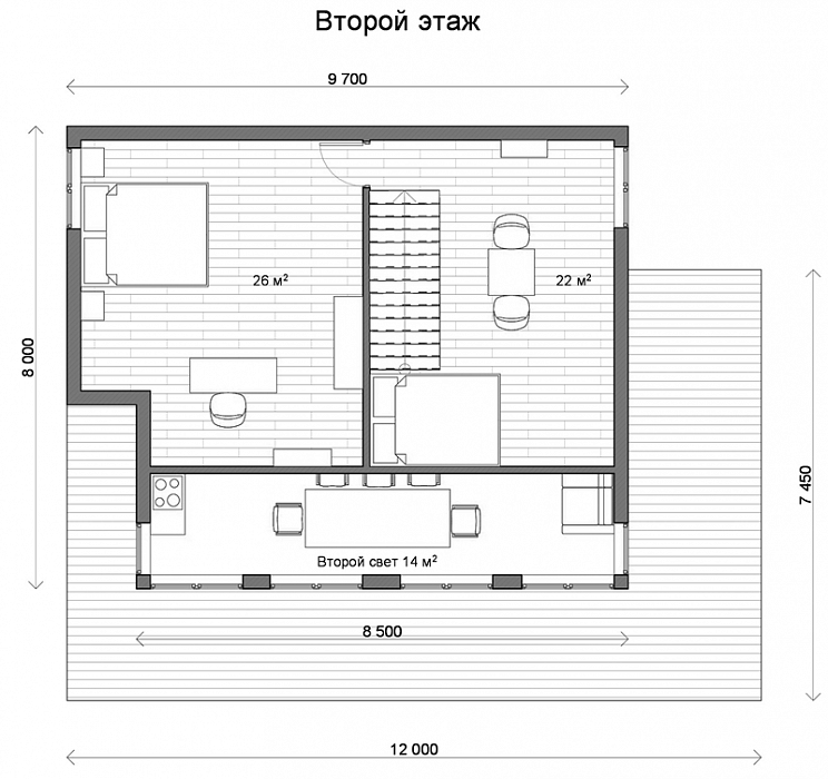 Классический проект Фахверк. Первый этаж выглядит весьма просторным. Дело в том, что его пространство абсолютно открыто: гостиная, кухня и прихожая-холл образуют единое помещение, из которого наверх ведет лестница. Кроме того, большое влияние на зрительное восприятие пространства и освещенность внутри дома стеклянный витраж большого формата и «второй свет». Прекрасная терраса с боковыми входами станет украшением Ваших вечеров и разместит большую дружную компанию.